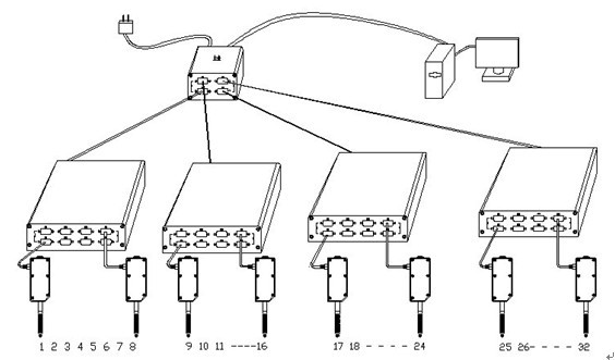 產(chǎn)品使用方法 1. 當(dāng)只檢測(cè)一個(gè)尺寸時(shí),數(shù)據(jù)需直接顯示,不需要連接電腦或PLC處理數(shù)據(jù) 采用測(cè)微計(jì)(CW-141A或CW-341A)與顯示盒(5011-001)的組合,顯示盒能顯示測(cè)微計(jì)的數(shù)據(jù),可以設(shè)置上下公差,并有公差結(jié)果顯示,直觀判斷零件好壞。 2. 當(dāng)檢測(cè)8個(gè)以下尺寸時(shí),數(shù)據(jù)需送到電腦或PLC處理 采用測(cè)微計(jì)(CW-141或CW-341),配合4路或8路集線器,數(shù)據(jù)經(jīng)過(guò)集線器采集由RS232串口進(jìn)電腦或PLC。 3. 當(dāng)檢測(cè)8個(gè)以上尺寸時(shí) 需要一個(gè)主集線器把兩個(gè)以上的分集線器組合起來(lái),實(shí)現(xiàn)多數(shù)據(jù)的測(cè)量(見下圖)。