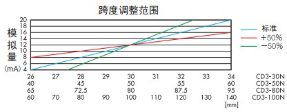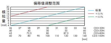 激光位移傳感器CD3系列產(chǎn)品特點(diǎn): ● 采用高精度CMOS感光元器件。 ● 模擬量輸出設(shè)有跨度(SPAN)和歸零設(shè)定功能,以滿足各種 應(yīng)用的需求。 ● 可預(yù)設(shè)模擬量的上下限值作為報(bào)警輸出。 ● 內(nèi)置數(shù)字顯示器。 ● 按鍵示教,數(shù)顯面板,操作簡便。簡易的示教按鍵,便于監(jiān)視的數(shù)字顯示器。 ● 無論是反射率高的光澤面,還是如黑色橡膠等低反射率的物體,CD3系列均能穩(wěn)定測量。 ● 電壓輸出轉(zhuǎn)換器CV-15 若需要將4-20mA模擬電流輸出轉(zhuǎn)換成1-5V模擬電壓輸出,則可連接電阻CV-15 。 ● 偏移值 設(shè)定偏移值是一個(gè)補(bǔ)償功能,可對(duì)正負(fù)極模擬輸出值進(jìn)行反轉(zhuǎn)。 設(shè)定范圍為傳感器檢測距離的±50% 。 ● 跨度調(diào)整 調(diào)整跨度值改變測量值(位移量)與距離之間的比例關(guān)系。 設(shè)定范圍為傳感器檢測距離的±50% 。 ● 超出量程時(shí)的模擬量輸出保持功能 當(dāng)模擬量值超出量程時(shí),有如下兩種保持功能可選: CLP 模式:模擬量值保持輸出24mA ; HOLD 模式:模擬量輸出值為正常測量時(shí)的后一個(gè)測量值。 激光位移傳感器CD3系列技術(shù)參數(shù):