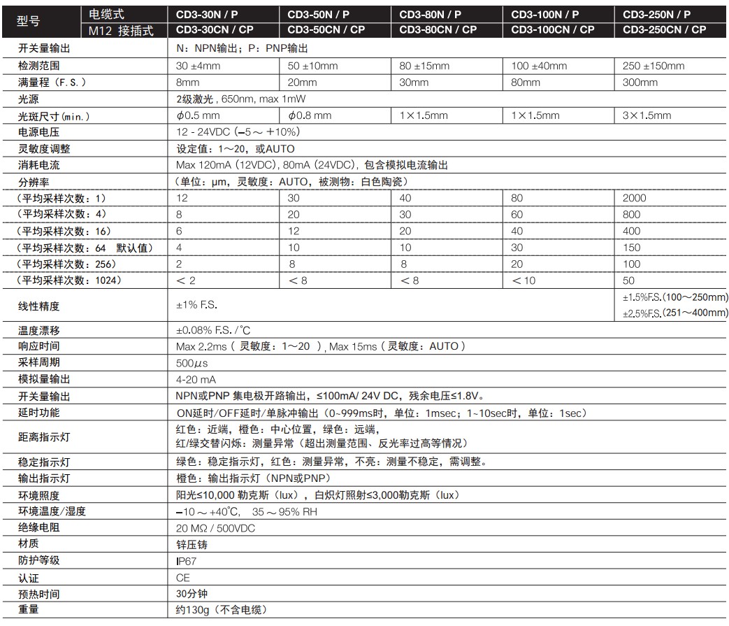 CD3系列激光位移傳感器CD3-30N/P/CN/CP-50N/P/CN/CP-80N/P/CN/CP -100N/P/CN/CP -250N/P/CN/CP