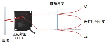 激光位移傳感器CD33系列產(chǎn)品特點(diǎn): ● 測(cè)量玻璃厚度 CD33-L□□正反射型傳感器可檢測(cè)玻璃表面,也可測(cè)量玻璃的厚度。