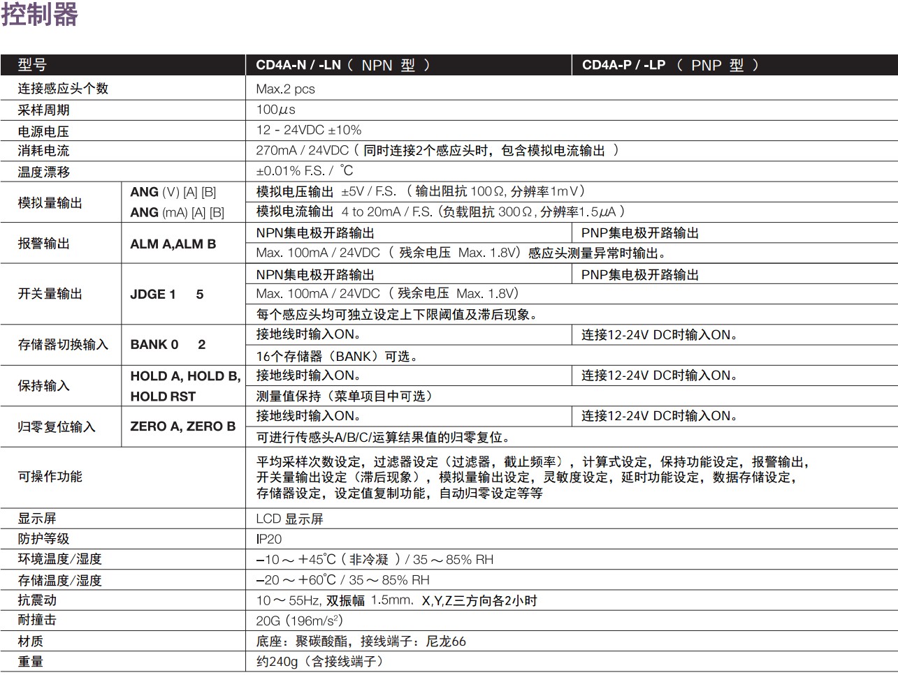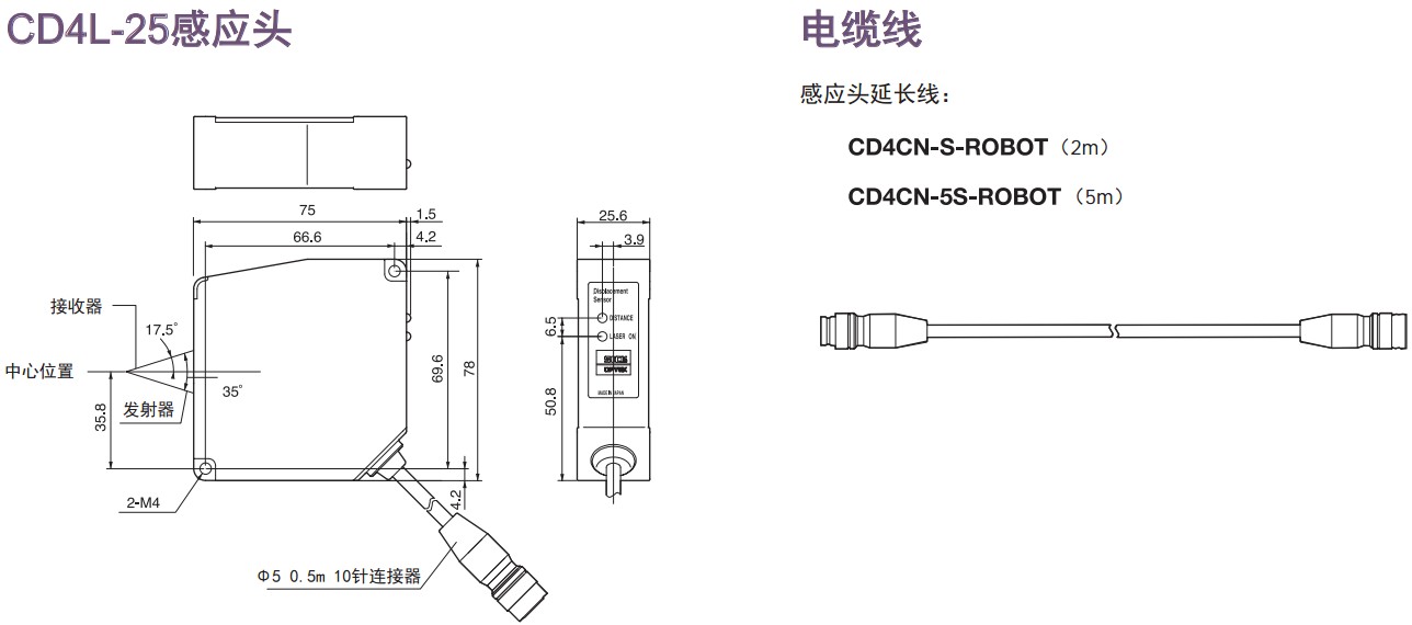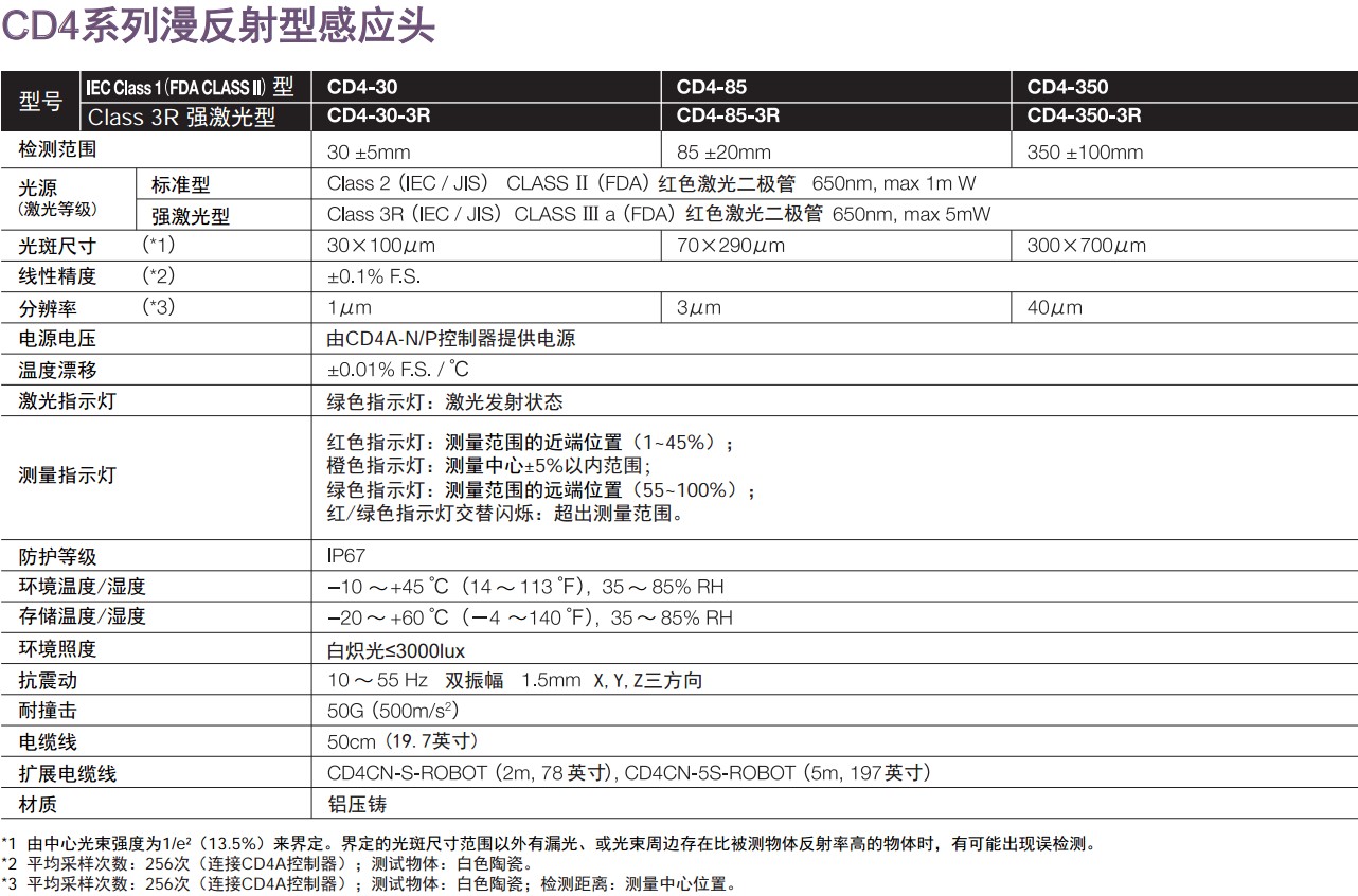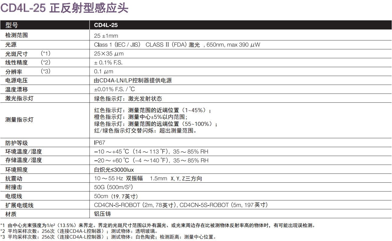 激光檢測(cè)儀,激光測(cè)量?jī)x,激光位移測(cè)量,CD4系列激光位移傳感器CD4-30/ 85/350 CD4L-25 CD4A-N/LN CD4A-P/LP激光位移傳感器CD4系列● 感應(yīng)頭+控制器,設(shè)定簡(jiǎn)單,操作方便?!?一個(gè)控制器可同時(shí)連接2個(gè)感應(yīng)頭。 ● 正反射型(CD4L-25)用于檢測(cè)玻璃/鏡面體。 ● 0.1μm高分辨率,±0.1% F.S.高線性精度(CD4L-25型)。