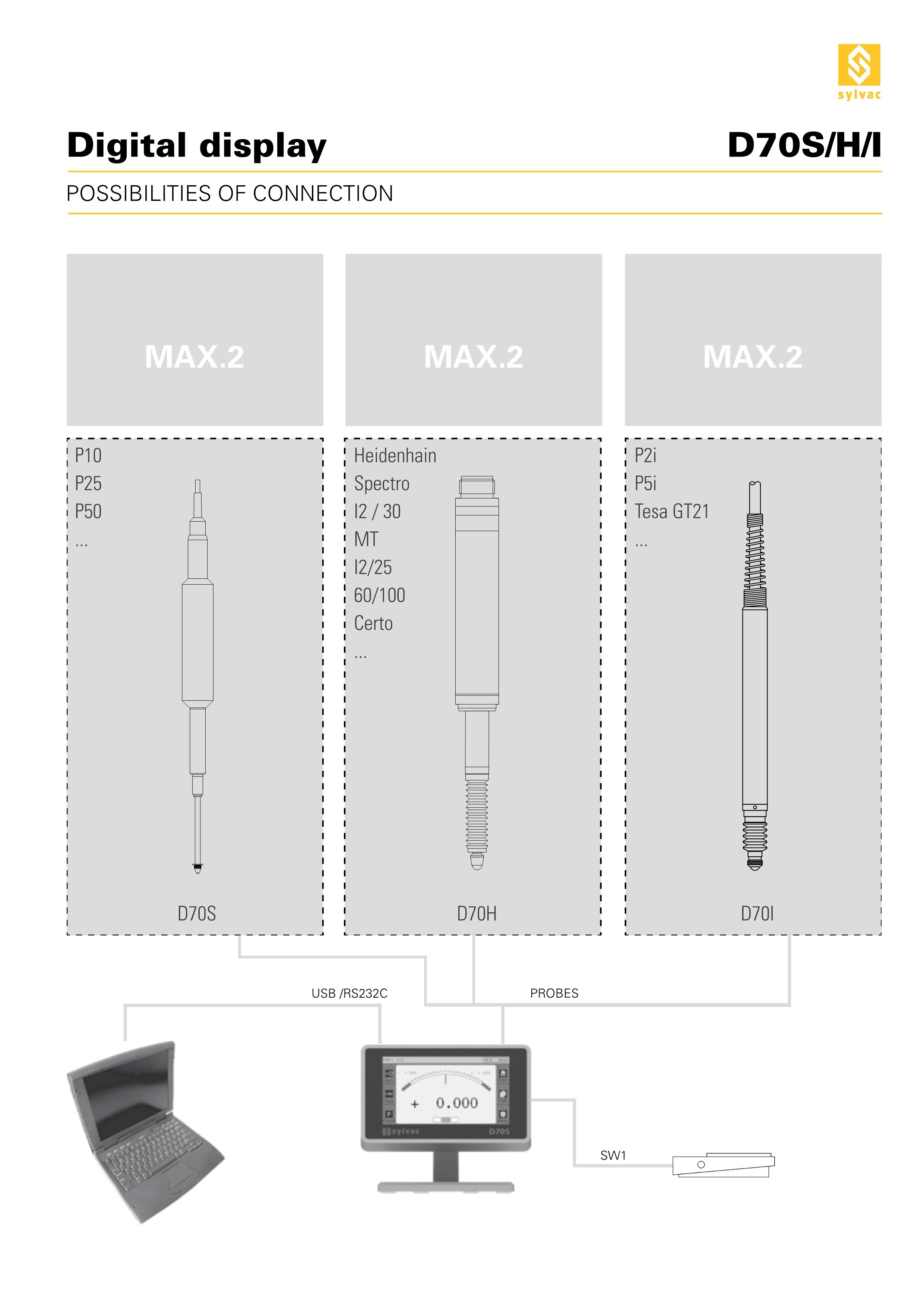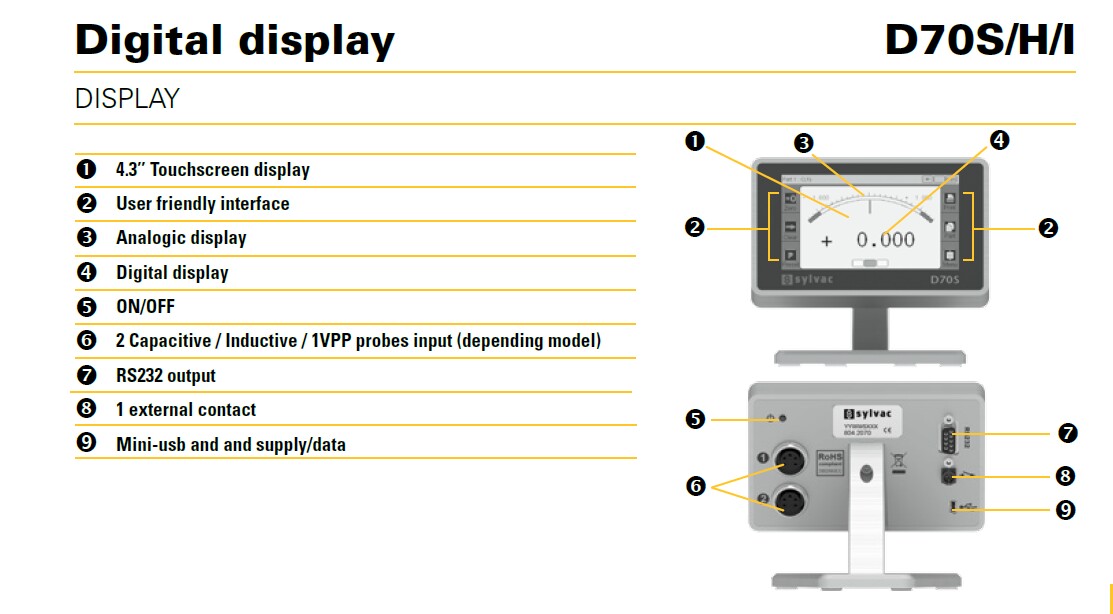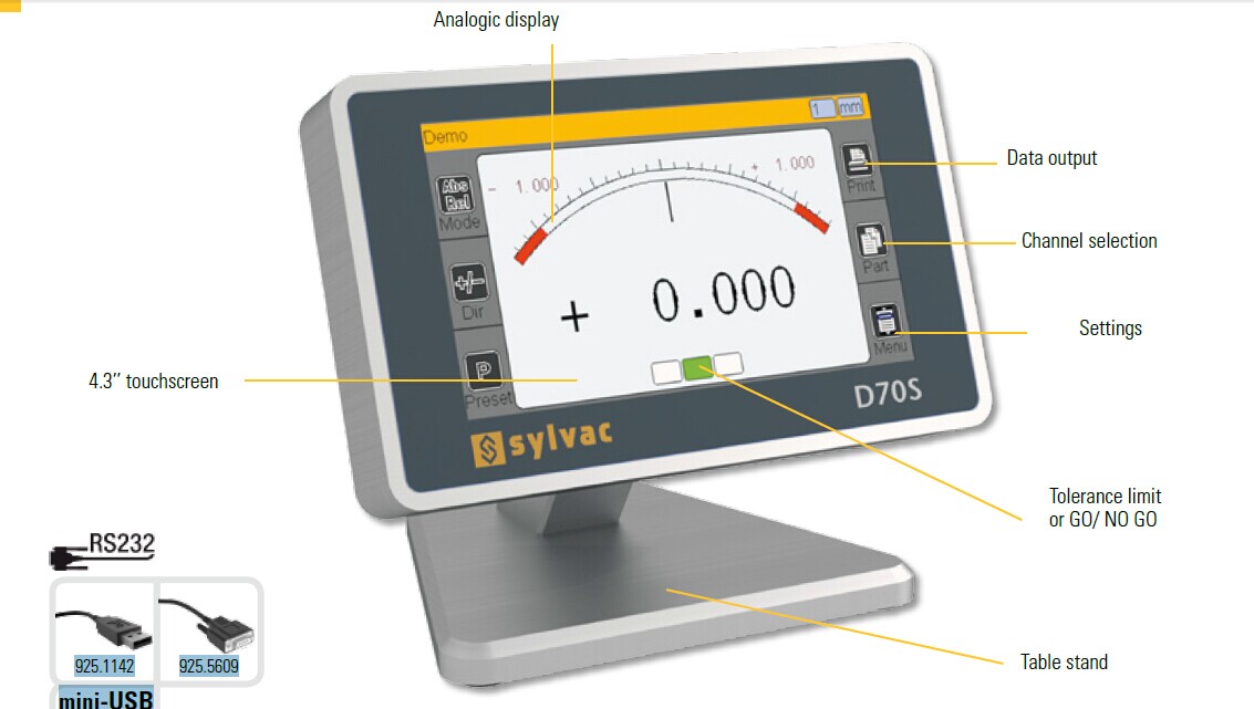 D70S/H/I 142 925.1142 925.5609 mini-USB 926.6001 Digital display DESCRIPTION ? 4’’3 touch screen display ? Available in 3 versions: - D70S for Sylvac capacitive probes - D70I for Sylvac inductive probes (also compatible with Tesa and Mahr probes) - D70H for Heidenhain ST/MT probes (Mitutoyo and Magescale probes with adapter) ? All versions with 2 probe inputs ? Display resolution selectable up to 0.00001 mm ? Simple or double display with bargraph, needle or no-tolerances ? Probe’s combination : (C1, C2, C1-C2 …) ? Direct measurement or Min, Max, Average, Max-Min… ? User friendly interface ? Very robust construction (Aluminium) ? USB connection ?Keyboard? unidirectional and RS232 bidirectional ? No driver, no software to be installed ? Compatibility Excel and SPC ? Powered by the computer when connected by USB cable ![]() ![]() ![]() 上一個(gè):瑞士SYLVAC D80S數(shù)顯裝置