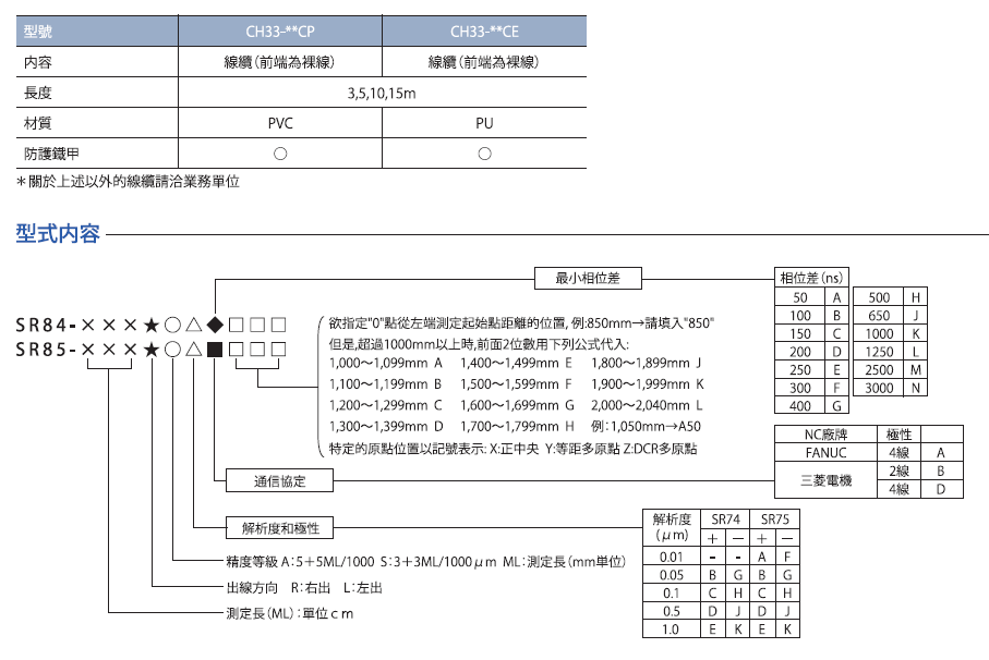 產(chǎn)品介紹簡單介紹: 多原點絕對式磁尺SR84/SR85:適合需要高精度定位工作機械的高剛性中型磁性尺,輸出信號為A/B相/原點差動信號(符合EIA-422)及增量式串列雙方向信號(符合EIA-485);適用工控系統(tǒng):FANUC、三菱電機、松下 產(chǎn)品特性: 高剛性多原點絕對式磁尺SR84/SR85:適合需要高精度定位工作機械的高剛性中型磁性尺,輸出信號為A/B相/原點差動信號(符合EIA-422)及絕對式串列雙方向信號(符合EIA-485);精度±(1.5+1.5L/1000)μm,測量長度:140-3040mm,分辨率0.01μm,響應(yīng)速度200m/min,讀數(shù)頭摩擦力1N以下。適用工控系統(tǒng):FANUC、三菱電機、松下。